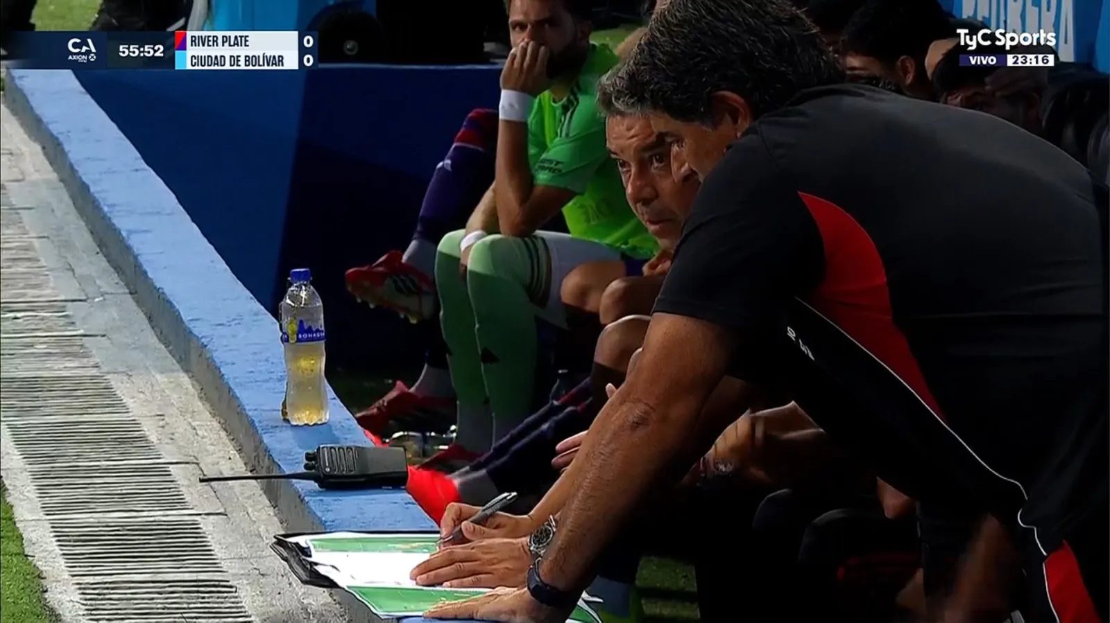 La ansiedad del técnico se hizo evidente a los casi once minutos del segundo tiempo, cuando una cámara lo captó junto a su ayudante de campo, Matías Biscay, mientras anotaba algo en un papel. La escena, que rápidamente circuló en redes sociales, mostró a Gallardo “sereno” en apariencia, pero con la mirada fija en la hoja, como si buscara la fórmula para revertir la situación. La presión se intensificó al recordar que River atravesaba una pequeña mala racha sin victorias en la temporada, con un empate y dos derrotas consecutivas.