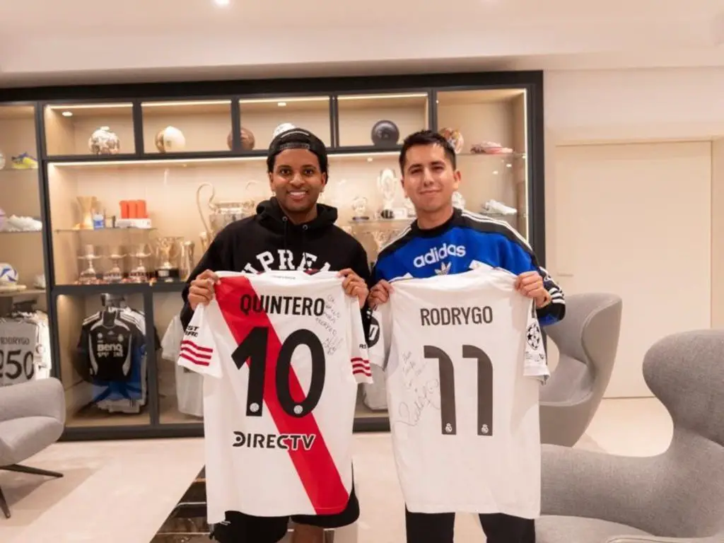 A través de una iniciativa de Montes, Quintero le envió a Rodrygo una camiseta de River con su emblemático número 10, como un gesto de camaradería y reconocimiento. La entrega no fue directa, sino a través de su representante, quien se encargó de llevar el presente al brasileño. Antes de recibir la casaca, Rodrygo no dudó en elogiar al colombiano, recordando con detalle su actuación en el Bernabéu. “He visto la final de Libertadores de aquí entre Boca y River. Él entró en la segunda parte, yo no me acordaba de él, pero entró en la segunda parte y muy bueno. Luego mete un gol, un golazo”, declaró el futbolista del Real Madrid, demostrando que el talento de Quintero trascendió fronteras y se quedó grabado en su memoria.