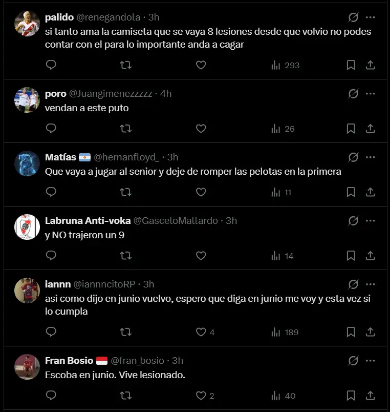 Los comentarios apuntaron principalmente a cobrar por productividad. Otros fueron más lejos exigiendo la renuncia del atacante. Lo cierto es que, bajo la conducción de Marcelo Gallardo, River pagó 10 millones de dólares para traer de vuelta a Driussi y esa plata todavía no se ha recuperado. Amar la camiseta no es solamente mostrarte con la misma a modo de pose en Instagram.