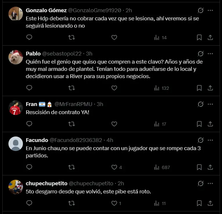 Esta nueva lesión despertó la furia de los hinchas del Más Grande en las redes sociales, quienes ven en él un desperdicio: tiempo, dinero y la ausencia de otros posibles jugadores que podrían ocupar su rol (como los pibes del club y potenciales refuerzos). La gente no quiere ver más a Driussi porque siempre termina igual: lesionado y perdiéndose compromisos trascendentales en el calendario.